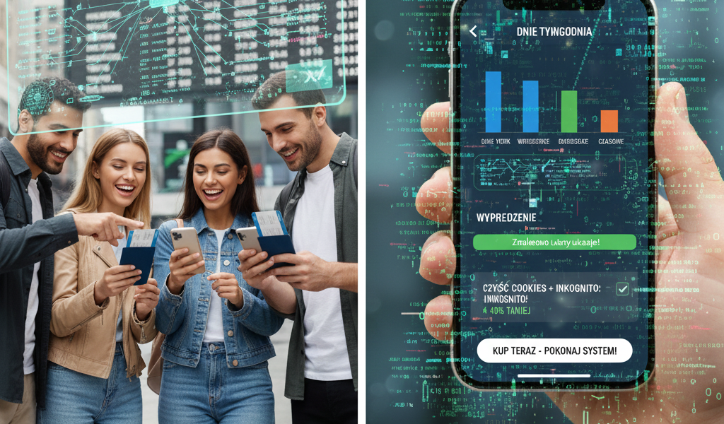 – **Twoje cookies i historię wyszukiwań** – powtarzasz trasę Warszawa-Bali? Cena skoczy w górę!